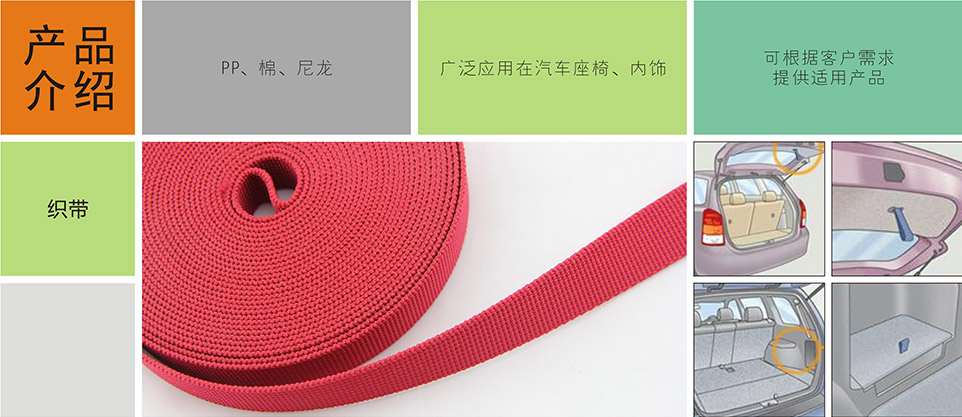 我們提供汽車專用拉鏈、標識扣、標識嘜、粘扣帶/刺毛帶,織帶/松緊帶,塑料扣件等其他汽車內飾、汽車座椅系統部件。
